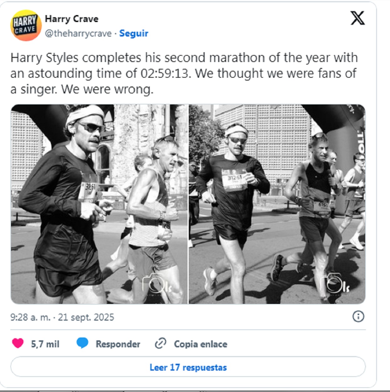 Revista del Domingo.- El artista británico Harry Styles (originario de Cheshire, Reino Unido, 31 años) participó este domingo 21 de septiembre en el Maratón de Berlín, su segunda carrera del año.