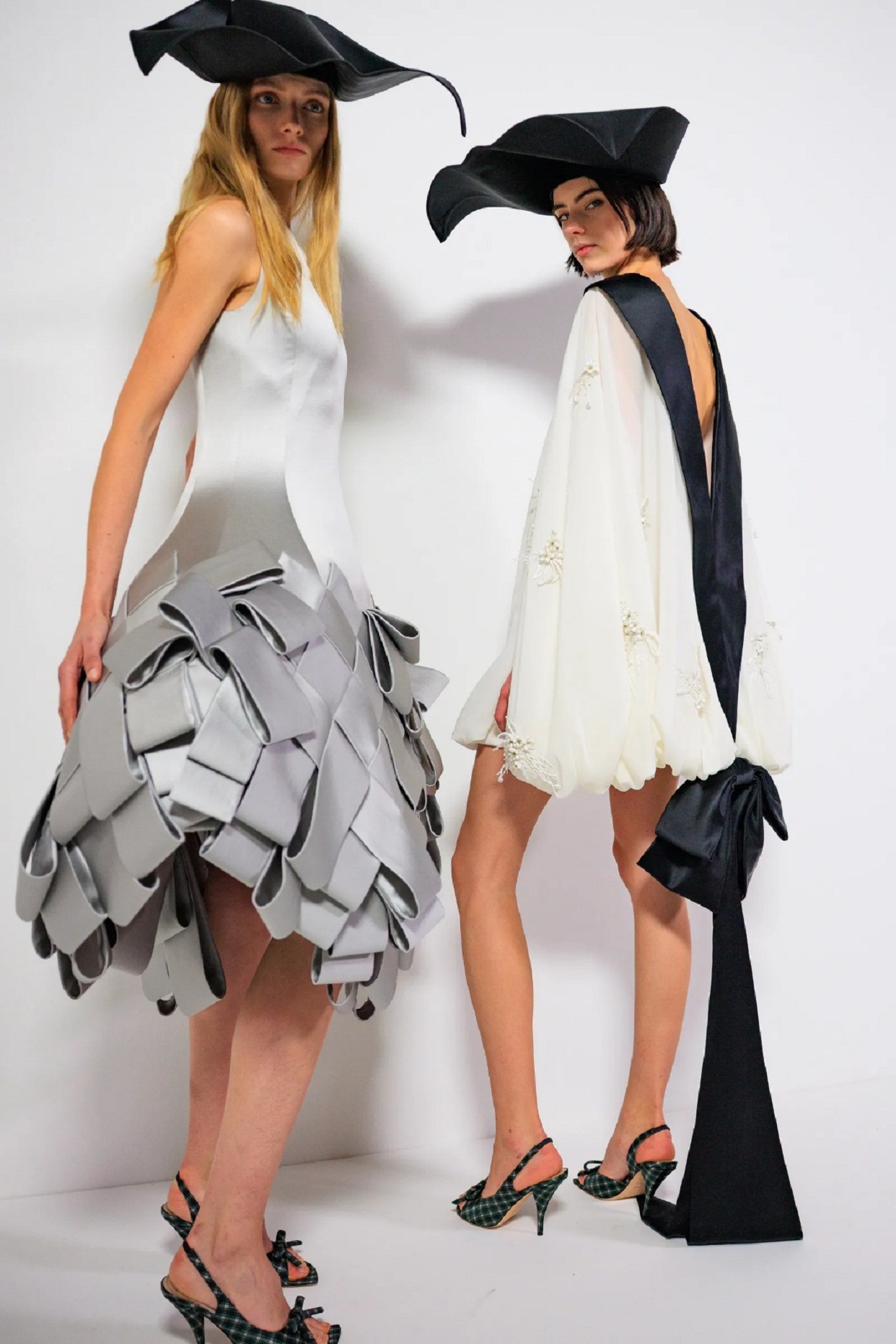 Su propuesta mezcla lo cotidiano con lo fantástico: camisas, faldas cortas y zapatos planos conviven con vestidos voluminosos, encajes y tocados teatrales. Anderson también incorpora referencias británicas, como capas de punto geométrico y un poema de Lord Byron como banda sonora del desfile.