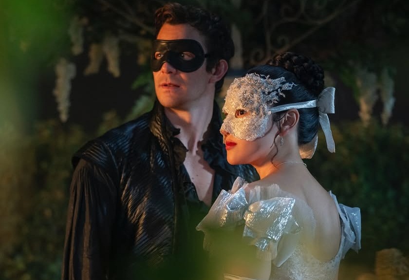 El teaser oficial muestra a Benedict y Sophie cruzándose en una majestuosa escalera durante el baile. Él lleva una máscara negra; ella, un vestido plateado y una máscara brillante. La tensión entre ambos es palpable desde el primer roce de manos.