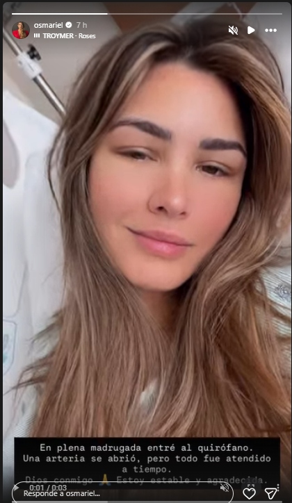 “En plena madrugada entré a quirófano. Una arteria se abrió, pero todo fue atendido a tiempo. Dios conmigo, estoy estable y agradecida”, escribió en una publicación difundida en video.
