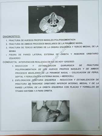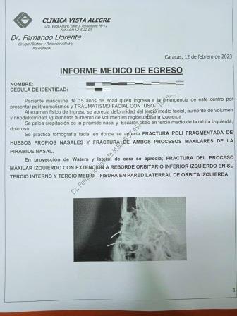 El menor de edad que será identificado con sus iniciales C.D.O.S. para mantener su privacidad, fue trasladado a la Clínica Vista Alegre en Caracas, cuyo informe médico diagnosticó: Fractura de huesos propios nasales polifragmentada, fractura de ambos procesos maxilares de la pirámide nasal, fractura del tercio medio de la órbita izquierda y tercio medial de la misma, fisura de pared lateral externa de órbita y reborde orbitario izquierdo. El cual requirió de una intervención quirúrgica.