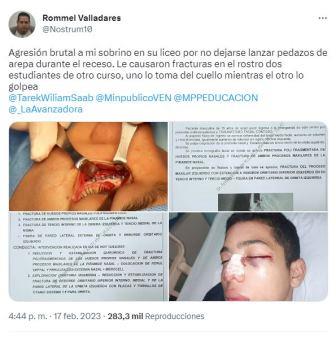 Sucesos.- Un adolescente fue golpeado presuntamente por dos de sus compañeros luego de pedirles que dejaran de lanzarle trozos de arepas durante el receso, en el liceo San Rafael de Pagüita en Caracas el pasado 12 de febrero.