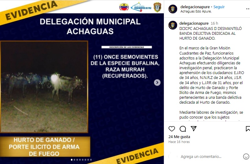 Los detenidos serán investigados por la presunta comisión del delito de hurto de ganado y porte ilícito de arma de fuego.