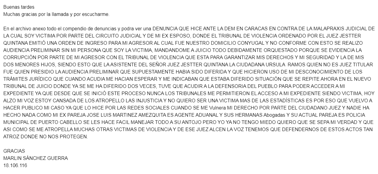 Anexando un amplio archivo -para resguardo de este medio de comunicación- indica que ha realizado la denuncia ante la Dirección Ejecutiva de la Magistratura (DEM) en la ciudad de Caracas, presentando irrefutables pruebas contra la delictiva conducta de Jestter Quintana, quien en una suerte de malabarismo judicial se ha combinado con el anterior cónyuge de la víctima que, a su vez, al parecer entregó una alta suma de dinero con la finalidad de que Quintana dictara una orden que le permitiera el ingreso a su hogar, para continuar con las repetidas prácticas de actos violentos sustentados en los expedientes