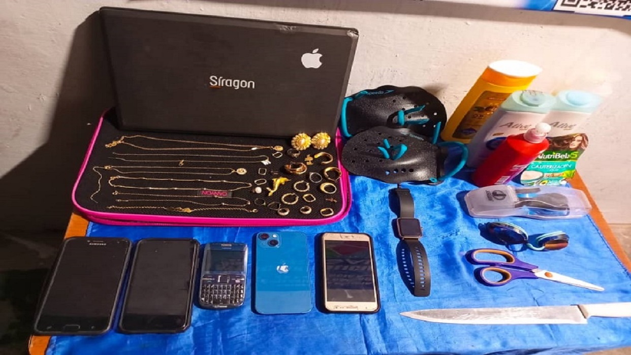 El funcionario dio a conocer que las evidencias recuperadas fueron las siguientes: una laptop marca Síragon, siete cadenas de oro, tres dijes, cinco argollas y tres pares de zarcillos de oro, una pulsera, cinco anillos, un prendedor de oro, cinco teléfonos celulares, un reloj digital, una tijera, un tratamiento capilar, cuatro envases de champú y acondicionador, una loción en crema, accesorios varios y dos bolsos.