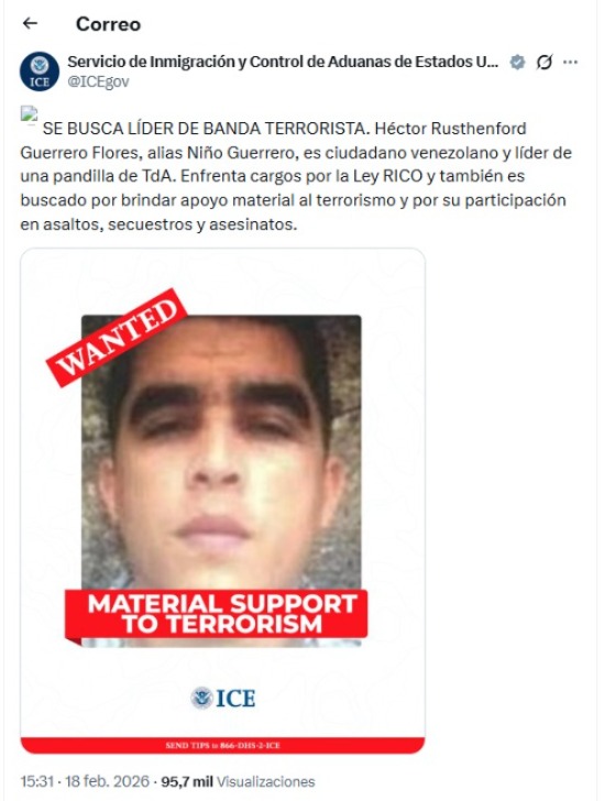 “Se busca al líder de banda terrorista. Héctor Rusthenford Guerrero Flores, alias Niño Guerrero, es ciudadano venezolano y líder de una pandilla del Tren de Aragua. Enfrenta cargos por la Ley RICO y también es buscado por brindar apoyo material al terrorismo y por su participación en asaltos, secuestros y asesinatos”, dice la publicación del ICE en X.