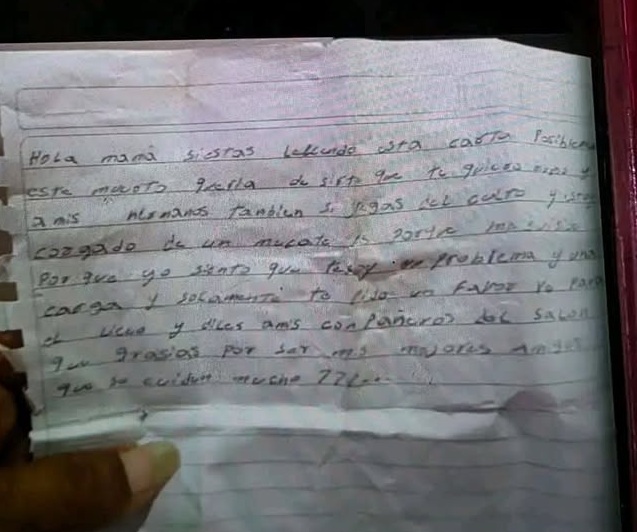 El joven antes de tomar la fatal decisión escribió una carta, expresando su sentirse con una carga económica y emocional. "Hola mamá, si estás leyendo esta carta posiblemente ya no esté. Quería decirte que te quiero mucho y a mis hermanos también. Si llegas y me encuentras, es porque siento que soy un problema y una carga. Solamente te pido un favor: ve al liceo y diles a mis compañeros de salón que gracias por ser mis mejores amigos, que se cuiden mucho", escribió.